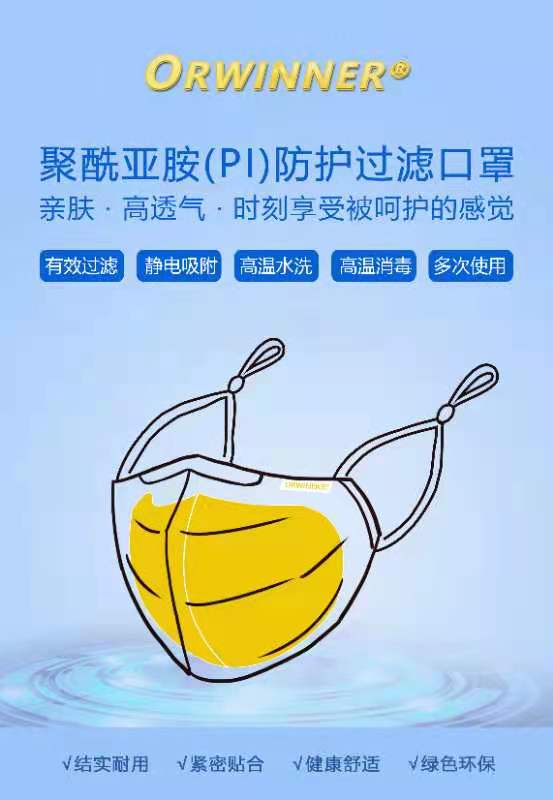 全球可反復(fù)使用的抗病毒聚酰亞胺口罩,優(yōu)點(diǎn):(1)可多次重復(fù)使用,佩戴使用之后可高溫消毒及多種形式的消毒殺菌,可在100度-1000度的蒸汽中消毒滅菌,或在烘箱中滅菌;(2)我們創(chuàng)新設(shè)置了三層結(jié)構(gòu):外層疏水層、中間過(guò)濾層(聚酰亞胺PI)、內(nèi)層舒適層(內(nèi)層面料不能太薄、太薄時(shí)可能堵鼻孔),中間過(guò)濾層PI新材料已獲得抗菌防螨檢測(cè)報(bào)告、防霉檢測(cè)報(bào)告、抑菌性能檢測(cè)報(bào)告、阻燃檢測(cè)報(bào)告、透濕檢測(cè)報(bào)告、透氣檢測(cè)報(bào)告、無(wú)有害物質(zhì)檢測(cè)報(bào)告、紅外測(cè)試檢測(cè)報(bào)告、信心紡織品檢測(cè)報(bào)告,過(guò)濾氣凝膠效率99.7%,三層保護(hù),過(guò)濾效能極高,是更安全的抵抗疫情新產(chǎn)品;(3)在聚酰亞胺(PI)膜兩側(cè)增加了防水層,可有效阻止?jié)駳鉂?rùn)濕PI膜,同時(shí)采用的PI膜也具有疏水特性。在內(nèi)層采用了棉織物層,在確保舒適、不過(guò)敏的同時(shí),能有效吸收水分,能長(zhǎng)時(shí)間保持舒適和過(guò)濾效果,可抑制細(xì)菌生長(zhǎng),還能減少異味的產(chǎn)生,減少口罩更換頻率;(4)PI材料透氣性更好;(5)采用的疏水層是嬰兒紙尿褲貼膚層材料,在觸感方面有優(yōu)勢(shì),佩戴舒適感好。